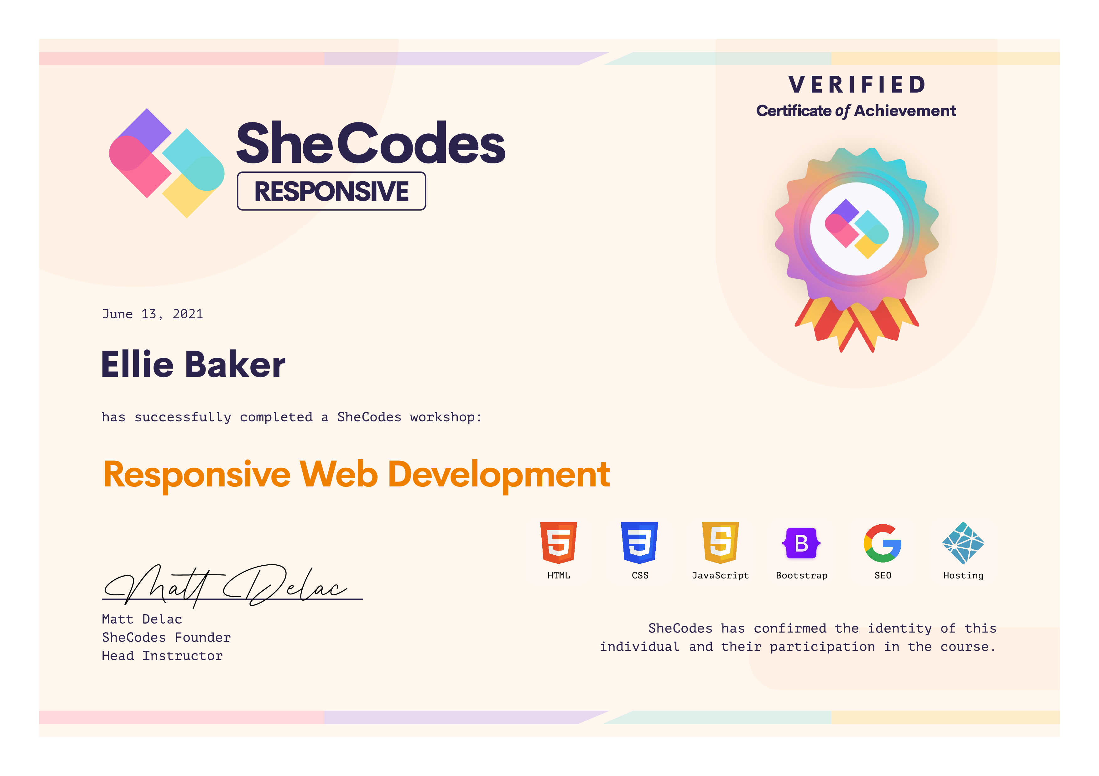 Comprehensive certification earned by completing the full SheCodes front-end development pathway: